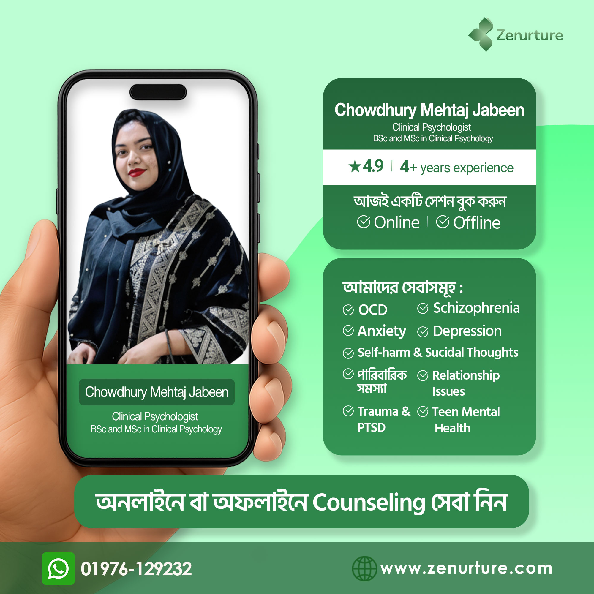 ২. বুকিং কনফার্মেশন আপনার বুকিং সম্পন্ন হওয়ার পর, Zenurture কেয়ার টিম থেকে একজন প্রতিনিধি ফোন বা মেসেজের মাধ্যমে আপনার সাথে যোগাযোগ করে সেশনের সময়টি নিশ্চিত করবেন।