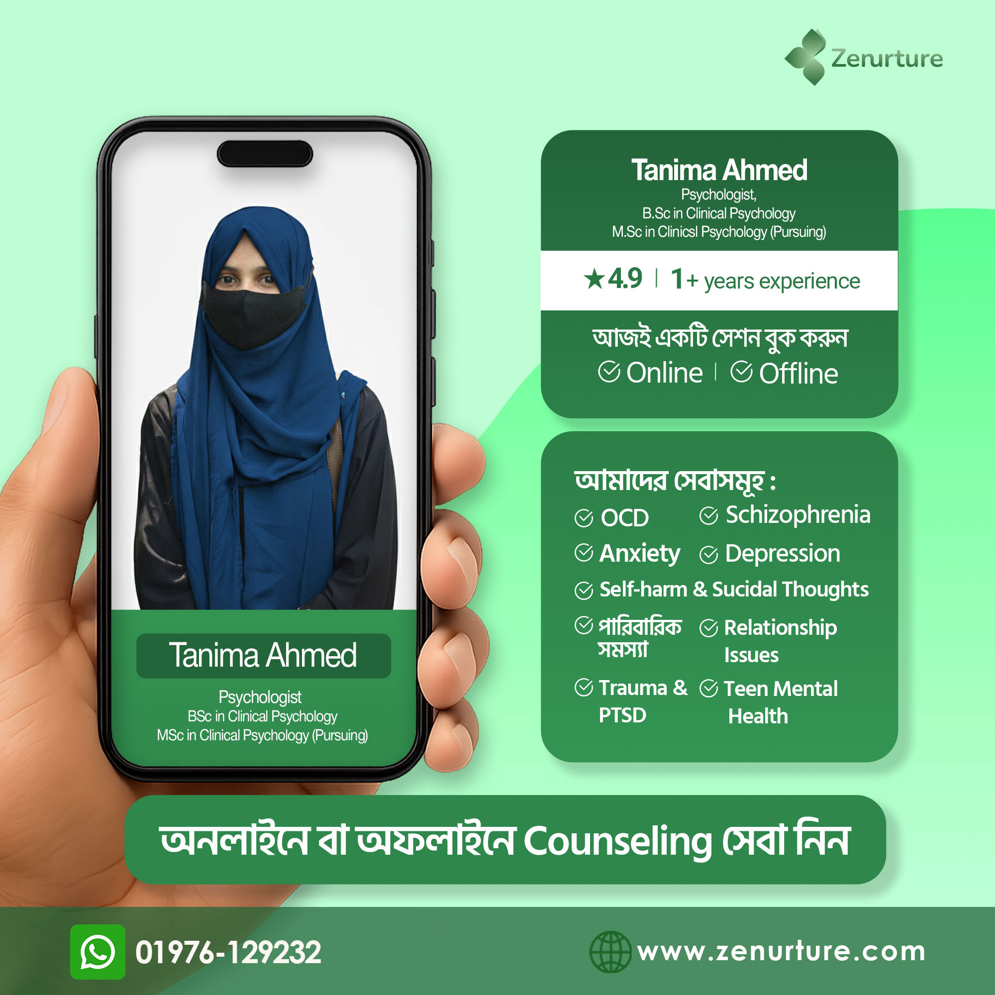 Tanima Ahmed is a dedicated Psychologist with a Bachelor of Science (B.Sc) in Clinical Psychology and is currently pursuing her Master of Science (M.Sc) in the same field. With over a year of practical experience, she provides empathetic and evidence-informed support to her clients. Ms. Ahmed specializes in addressing a wide array of psychological concerns, including anxiety, depression, OCD, trauma, and relationship issues. She is committed to creating a safe, non-judgmental space for individuals to explore their challenges and work towards mental well-being and personal growth.